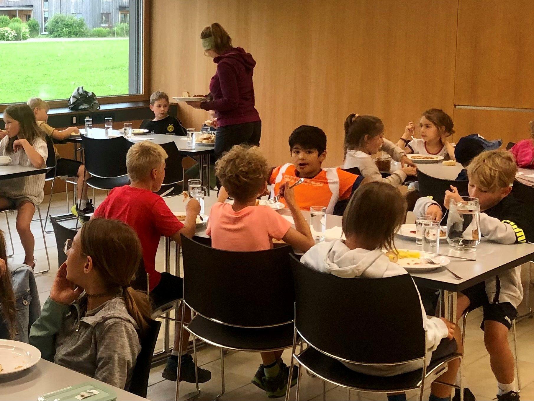 Die Mittagsbetreuung findet im schönen Esszimmer des Lernhauses statt. Es wird den Kindern eine warme Mahlzeit von 'FairKocht' serviert, der für seine Schulverpflegung mit dem höchsten Qualitäts-Level ausgezeichnet wurde. Es kann aber auch eine mitgebrachte Jause dort gegessen werden.